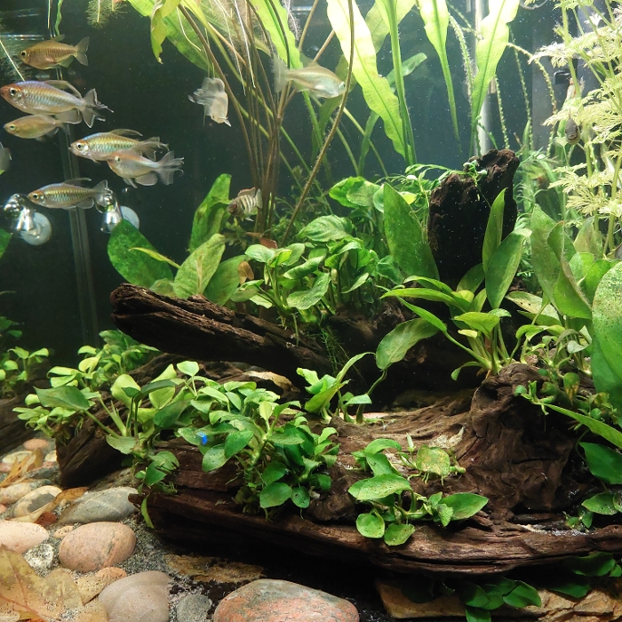 Planter: Anubias spp., Nymphaea lotus, Crinum natans, Crinum calamistratum, Bolbitis heudoltii, Aponogeton madagascariensis, Limnobium laevigatum.