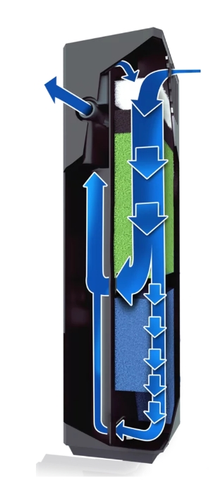 Strømmeretningen på vannet er fra toppen og ned og følgende svamper og filtre er satt i nå.